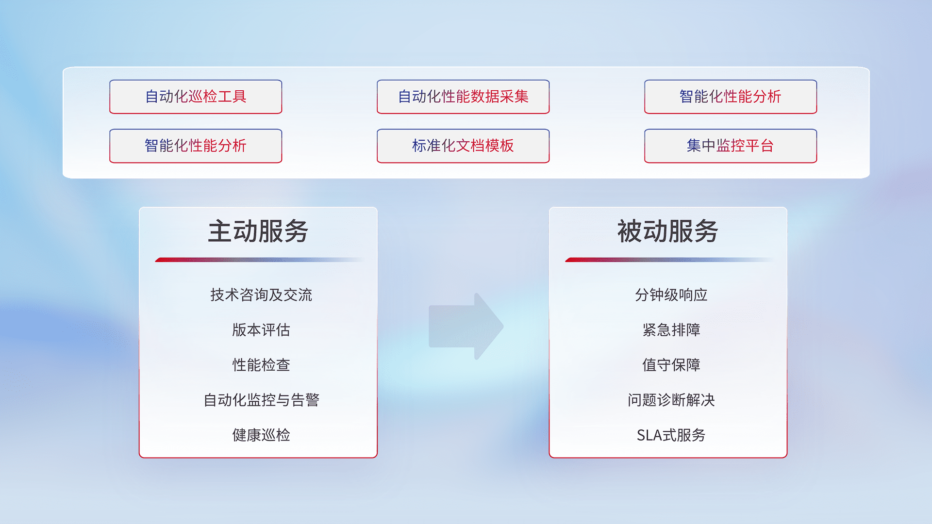 智能化工具和标准化文档,,,保障服务质量,,提供主动服务(包含技术咨询、、、版本评估、、、性能检查、、、自动化监控与告警、、、、健康巡检)和被动服务包含(分钟级响应、、紧急排障、、、、值守保障、、、、问题诊断解决、、、SLA服务)。。